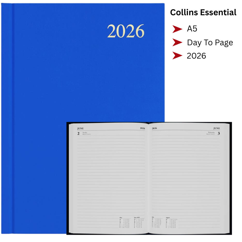 Brighten your planning with the 2026 Collins Essential A5 Day To Page Diary in vibrant colours. Compact yet spacious, this diary is ideal for everyday scheduling whether at home, work, or on the go.