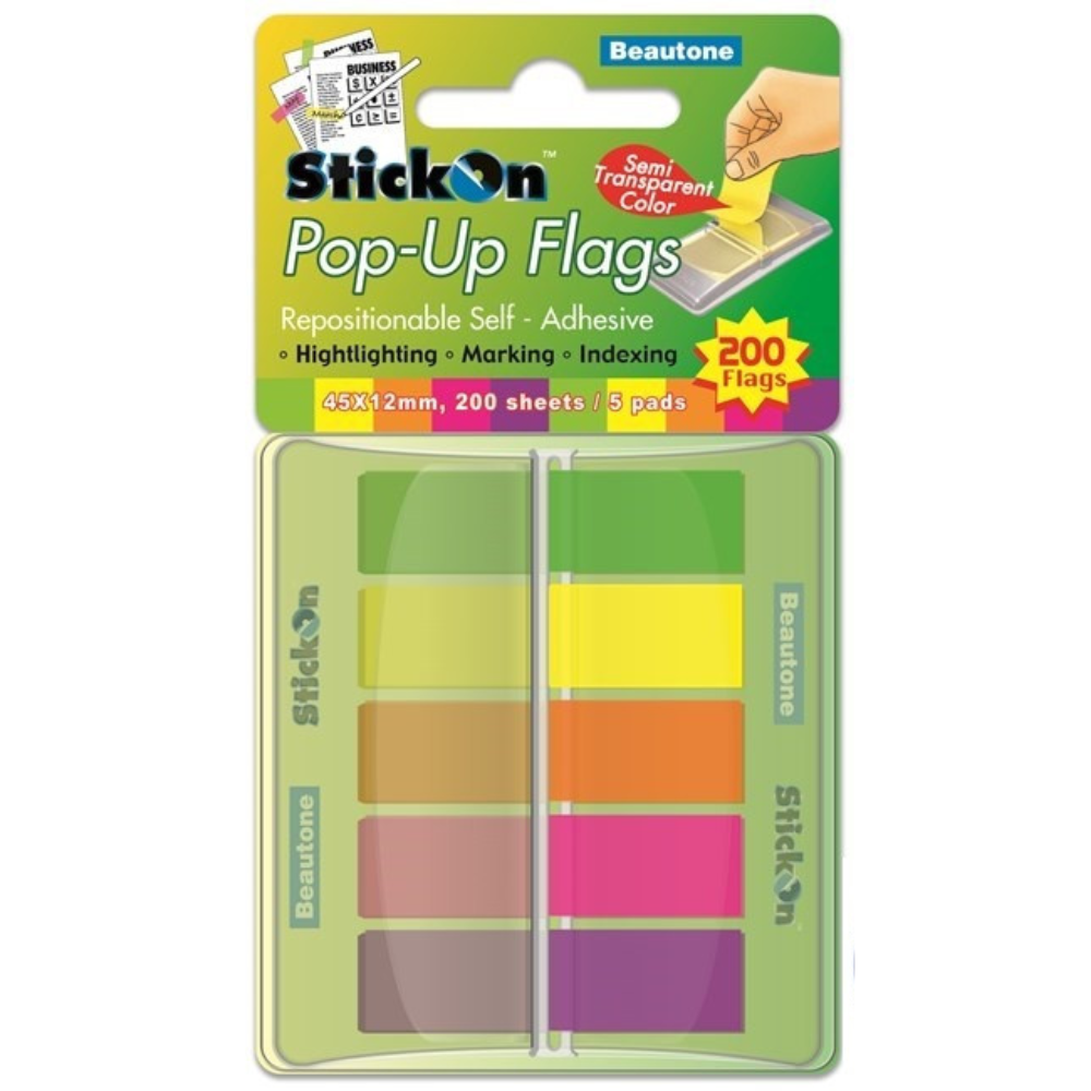 Beautone Stick On Flags Pop-up 45x12mm 5 Assorted Pads - 200 Sheets