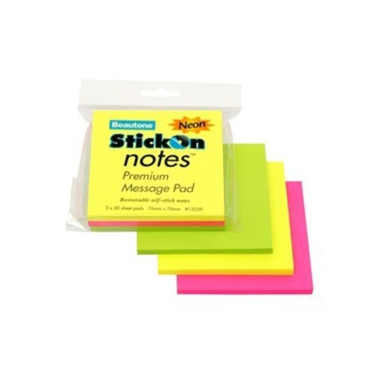 Beautone Stick On Notes 76x76mm Neon Colours - 3 Pack​