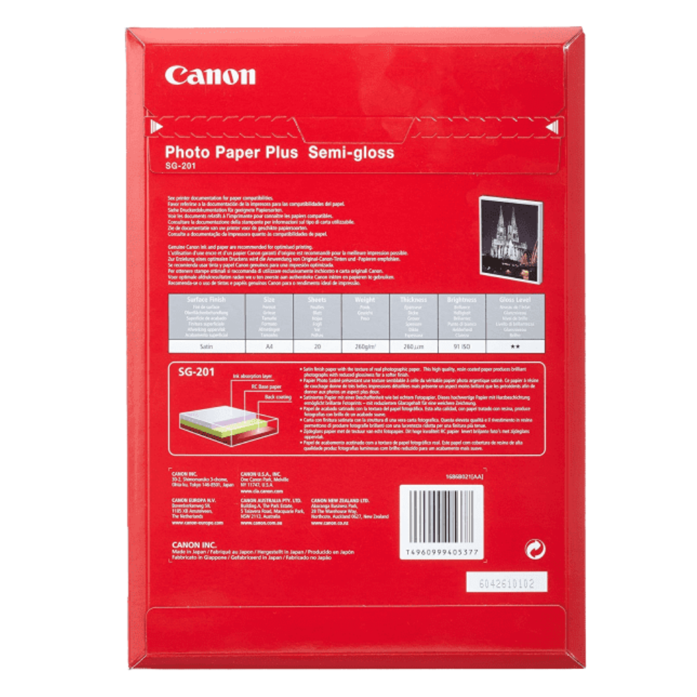 Canon Genuine A4 Photo Paper Semi Gloss Inkjet 260gsm SG-201 - 20 Pack
