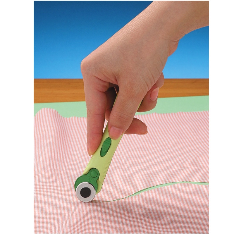 Clover's Soft Cushion Handle Rotary Cutters cut fabric beautifully with just the right amount of blade exposed, whether the cutter is held upright or at an angle.