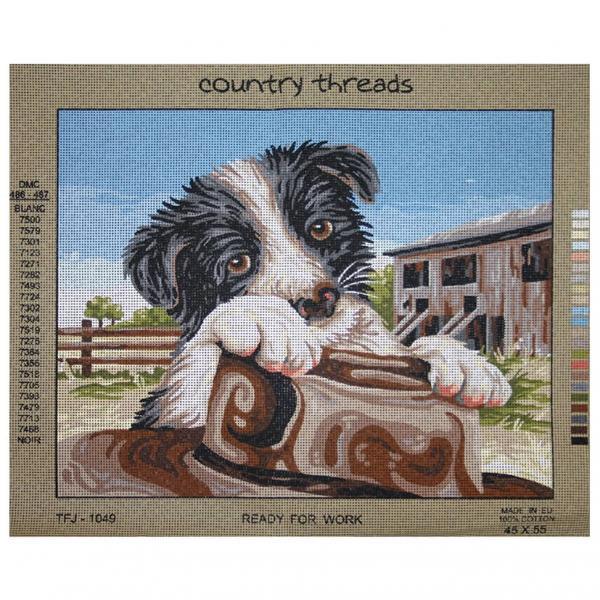 READY FOR WORK Tapestry Design Printed On 100% cotton Canvas TFJ-1049Finished size 45cm x 36cmPrinted Canvas Only.Double weave 10 count Penelope canvas, printed in Greece.An eager Collie waiting for his master by Fiona Jude.Requires Threads as per list included with canvas and below. Thread / wool quantities are based on standard continental stitch.