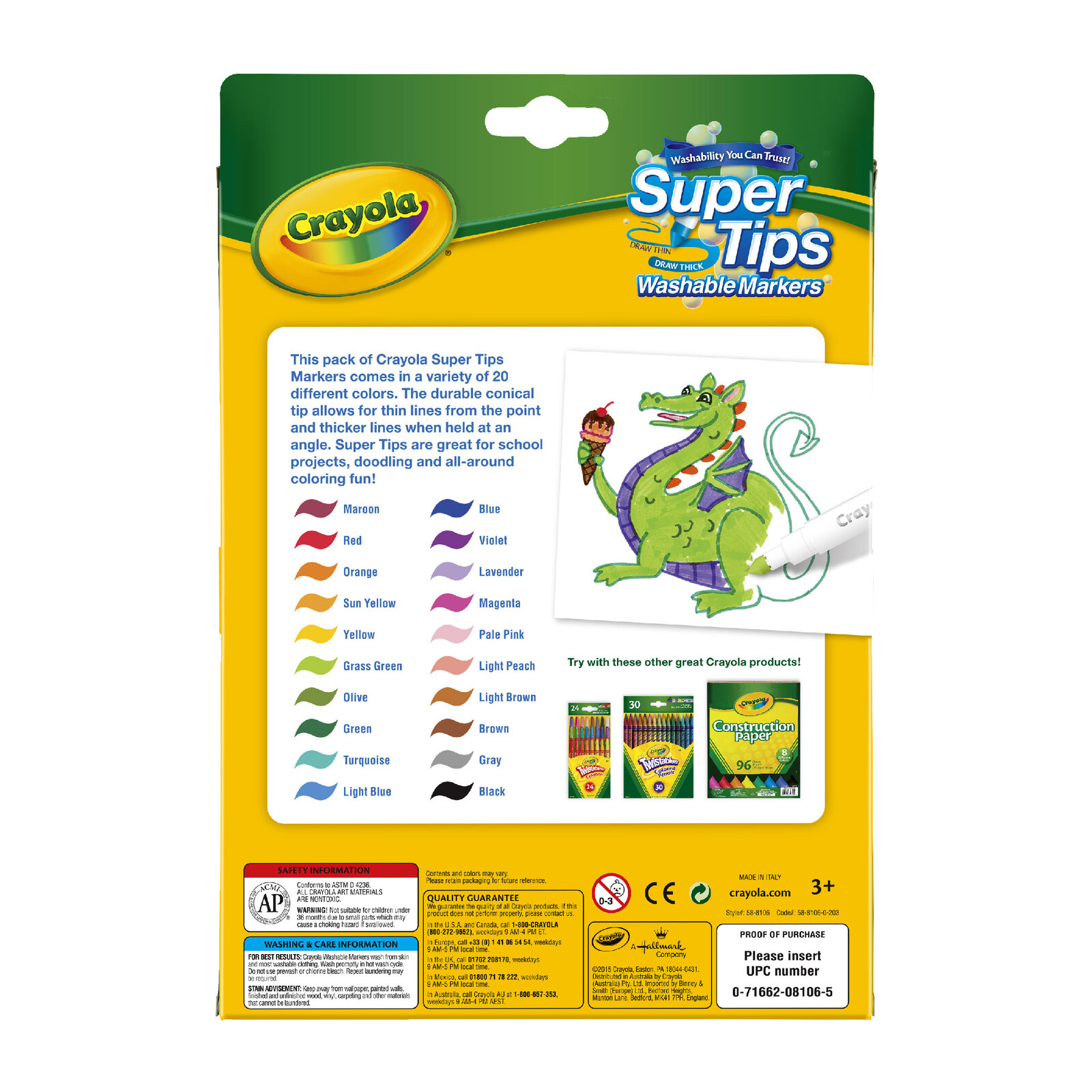 Washable Super Tips Markers are specially formulated to have the bright, vivid colors and overall great quality you expect from Crayola products. The Markers feature a versatile tip that draws both thick or thin lines. When compared with other Markers ours are longer-lasting and wont dry out as the tip can be rejuvenated by dipping in room temperature water. Crayola's washable ink is specially formulated to wash off machine washable clothing. It also washes off walls, carpet and furniture with warm water and a sponge because not thieving your child makes is a keeper! Includes 20 colors with 5 scented markers