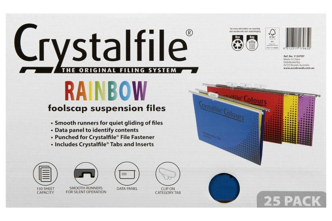 Crystalfile Foolscap Suspension Files 112478Y Assorted Colours - 25 Pack