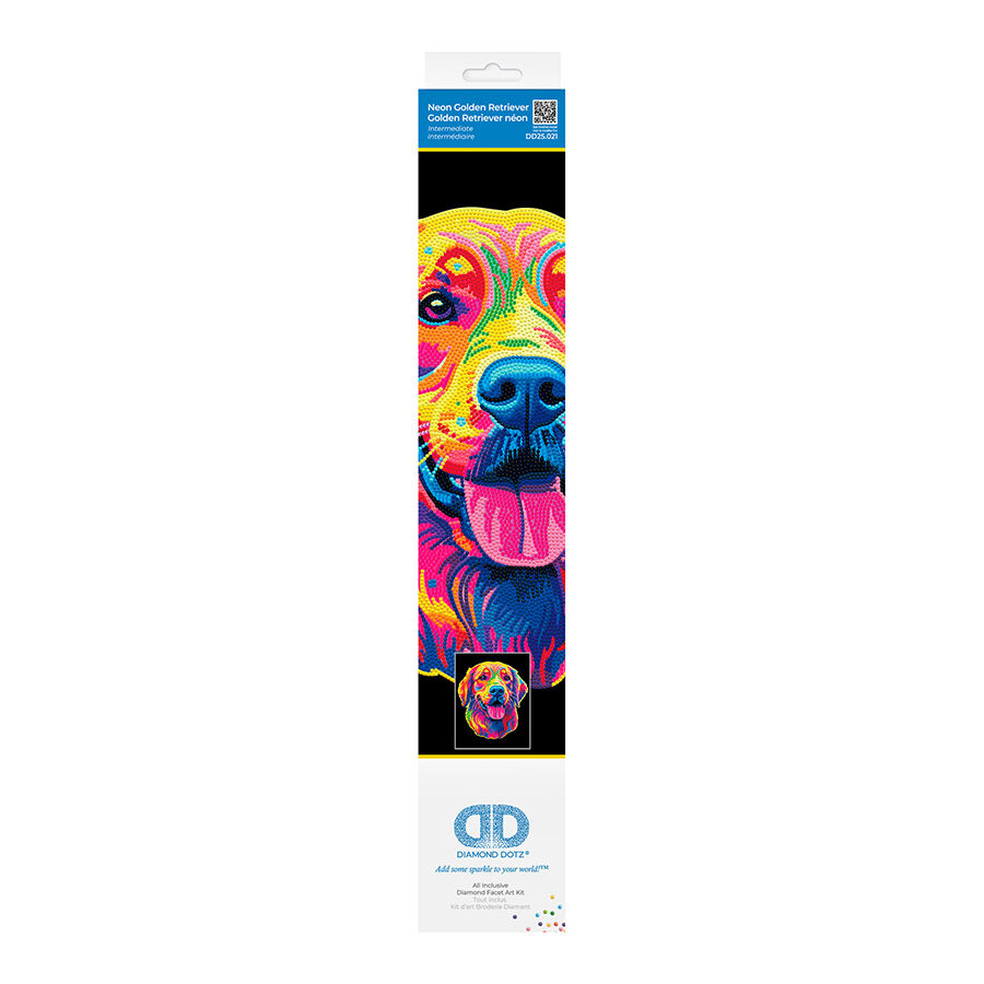 Create a vibrant and heartwarming piece of diamond art with the Diamond Dotz Neon Golden Retriever Diamond Painting Kit. This striking design features the beloved golden retriever brought to life with glowing neon colours that stand out beautifully against a bold black background. The colourful highlights and detailed artwork capture the friendly and loyal nature of this popular dog breed, making it a perfect project for animal lovers and craft enthusiasts.