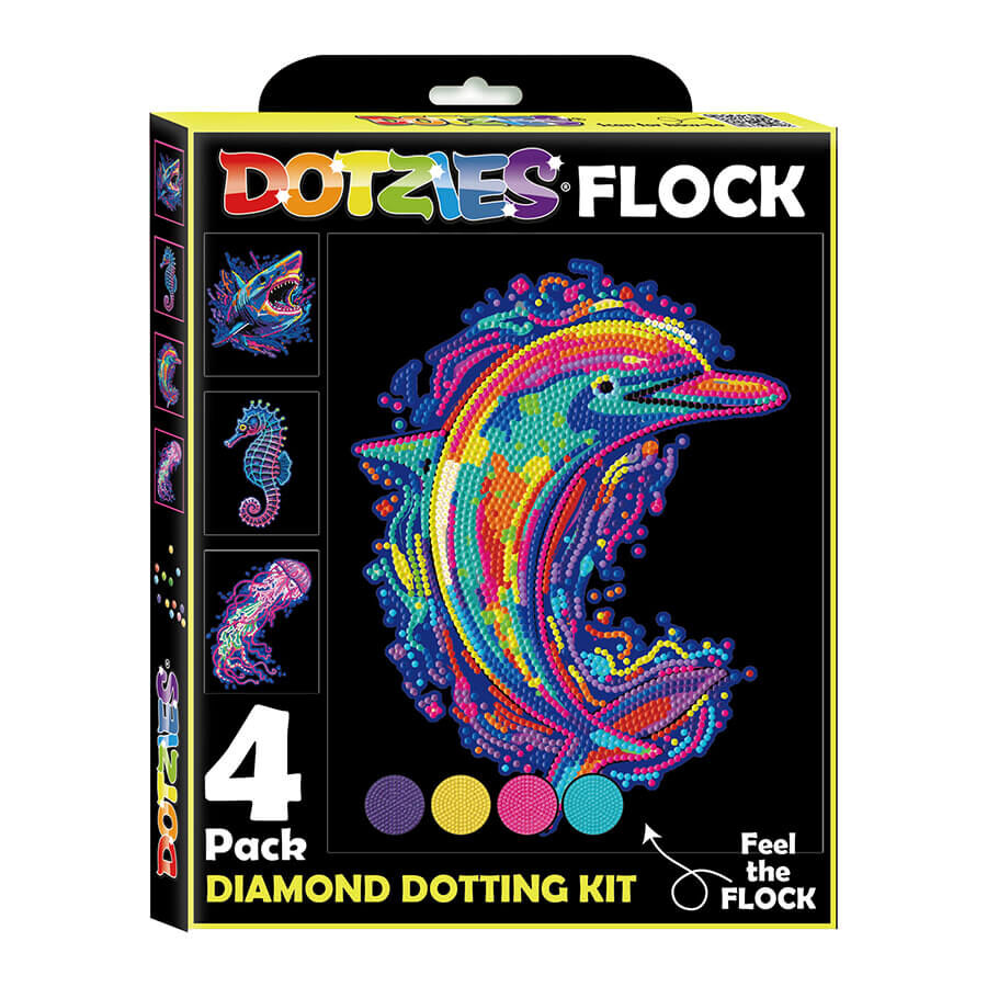Part of the unique Neon Dotzies Flock series, this kit uses a soft velvet-like flocked black canvas that enhances the brightness and contrast of the neon diamonds. The textured background creates a glowing visual effect, allowing the vibrant sea life designs to stand out beautifully once completed.