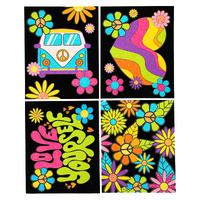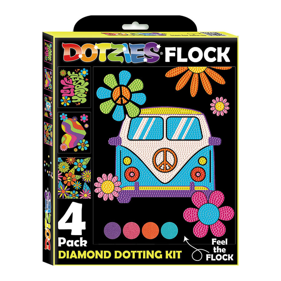 A unique diamond painting innovation: Bright neon Dotz placed on a soft velvet-like flocked black background. These kits feature four mesmerising mini designs each bursting with vibrant neon tones against a rich black background.