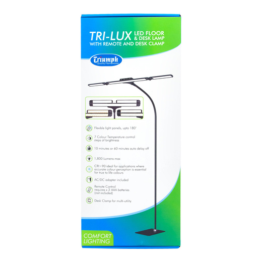 Illuminate your workspace with precision and style using the Tri-Lux Triumph 1500LMS LED Lamp Black. Designed for versatility, this lamp functions as both a floor and desk light, offering adjustable brightness, a convenient remote, and a built-in timer—perfect for crafting, reading, or detailed work.
