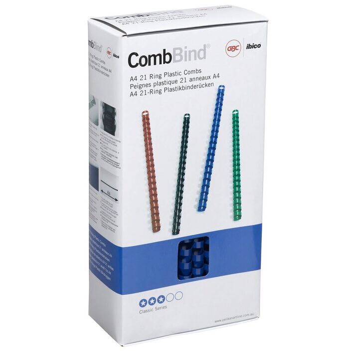 These GBC Plastic Binding Combs are strong and durable and add a great finishing touch to a range of documents including presentations, reports and projects for school or home office use. The 12 mm GBC Plastic Binding Combs have 21 loops that securely hold up to 90 sheets of A4 paper.