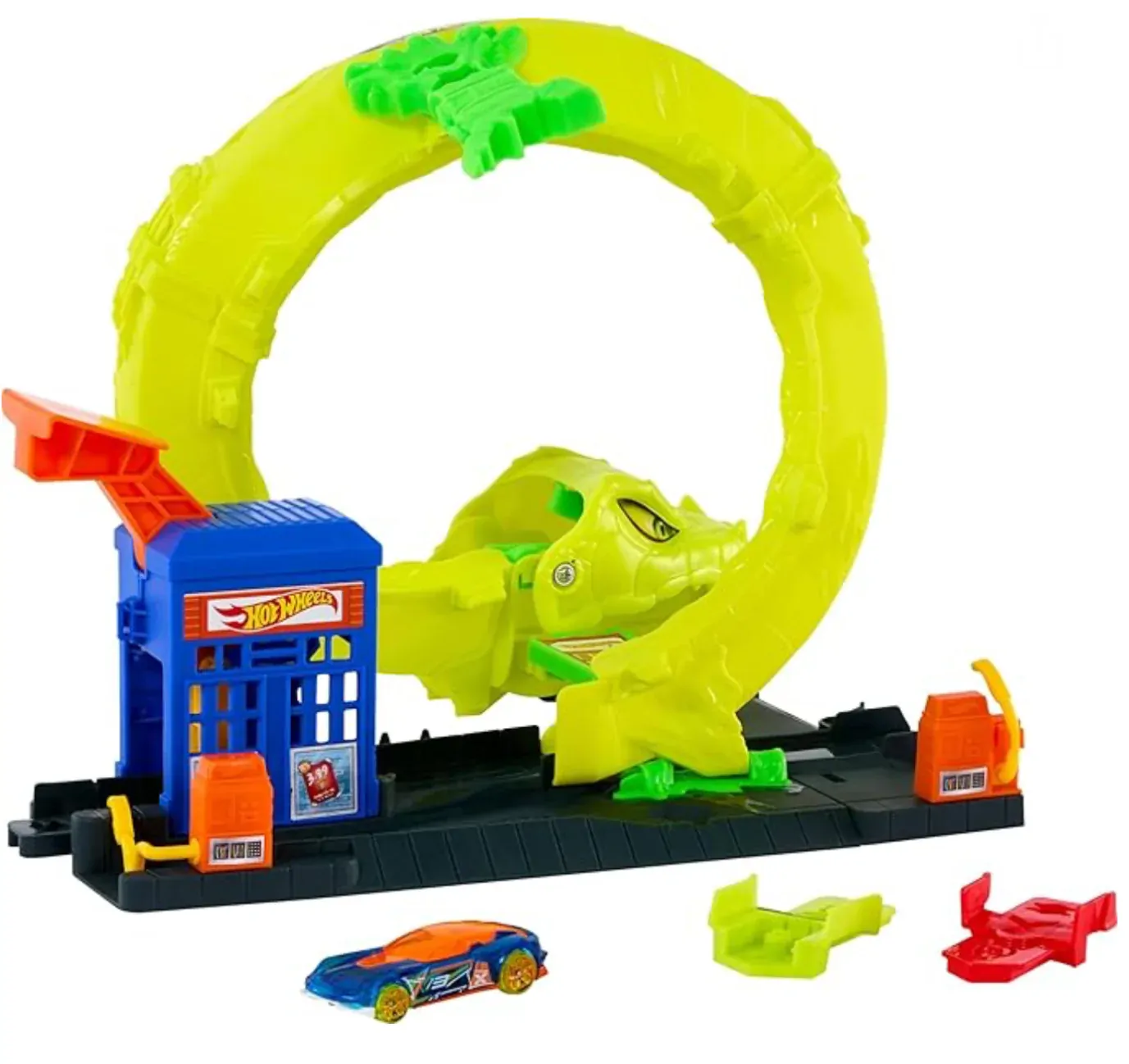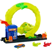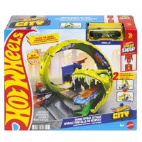 The city is under attack! A massive cobra has taken over the Hot Wheels City spiral tower, and it’s up to you to race, launch, and defeat the slithering beast. Kids can send their Hot Wheels cars speeding through the spiral track to build momentum and take on the cobra’s fangs. Will your car escape — or get trapped in the snake’s jaws?