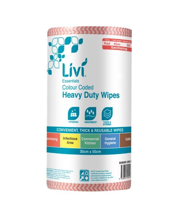 Recommended Usage: Sanitising. Avoid cross contamination with colour coded absorbent wipes for reuse in demanding applications or tackle the tougher tasks with the Livi heavy duty industrial spec turbo wipers. The Livi Red commercial wipes are suitable for use on surfaces and equipment at home or at workplace. These wipes prevent cross contamination and sanitise and act as disinfectant. It has 90 sheets per roll and is perforated for controlled usage. HACCP certified, each non woven wipe is 70 grams per square metre making them thick and strong for extra absorbent results.