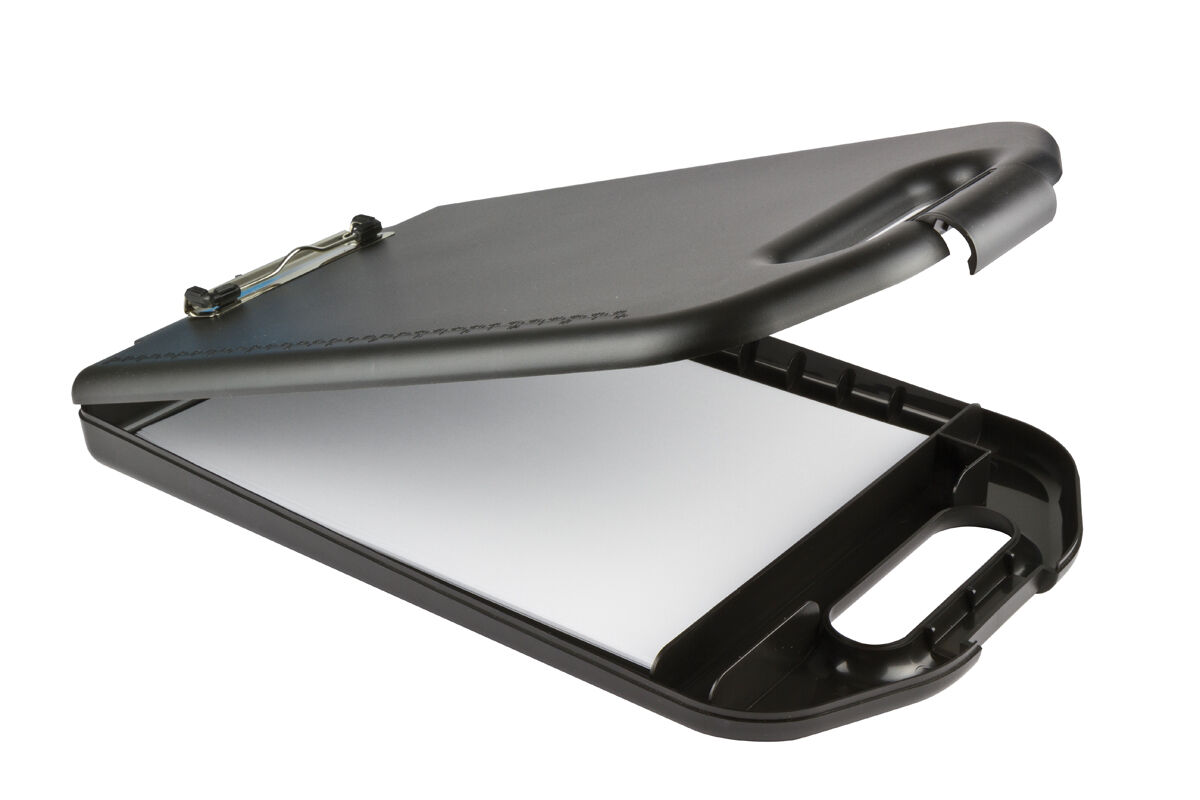 Storage clipboard top opens to a filing space beneath to store loose papers, brochures and documents