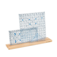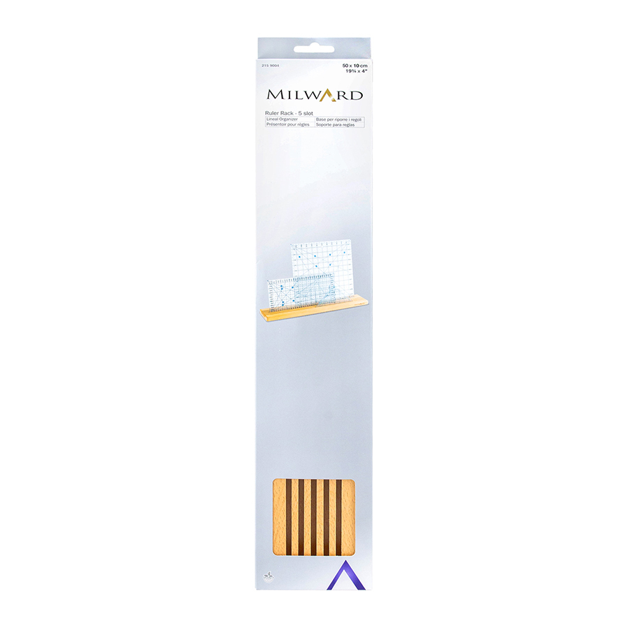 Store your quilting rulers or templates using this ruler rack. Display threads on front pegs and pins and clips in the front carved compartment. Pads are stuck on the bottom of the rack to prevent slipping. Made from durable beech wood with a smooth finish. Laser etched with the Milward logo.
