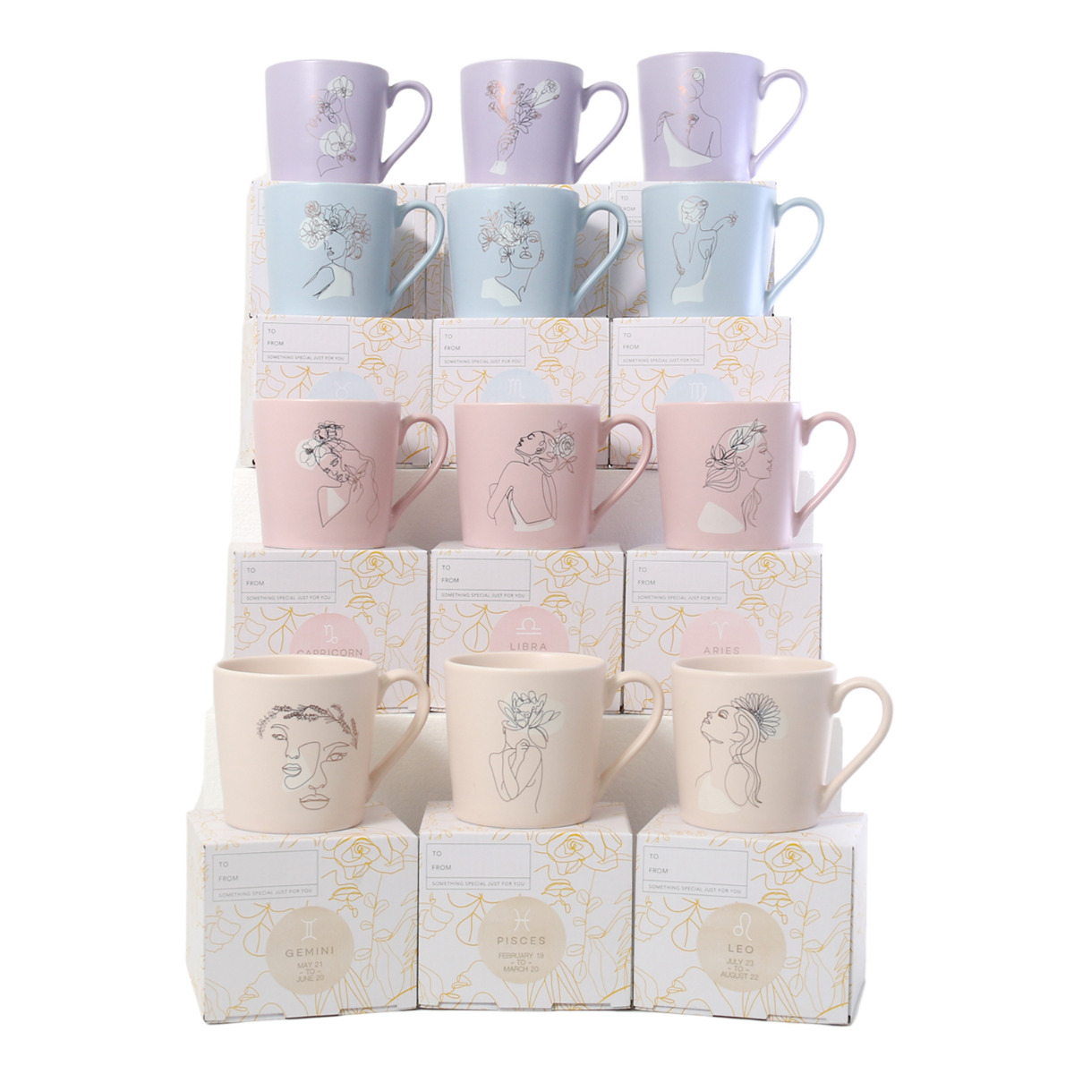 Quality ceramic mugs for each star sign with intricate gold foil detailing against a backdrop of our signature Mystique pastel hues and rose gold keychains with an assortment of charms including enamel zodiacs and opulent crystals, the Mystique collection evokes the spirit of inspirational gifting.