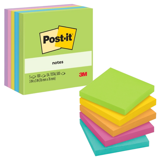 Post-it Notes are great for taking down phone numbers, writing quick reminders and even leaving short notes around your workspace. These bright, vibrant notes have a long lasting self-adhesive backing which removes without leaving any sticky residue behind.