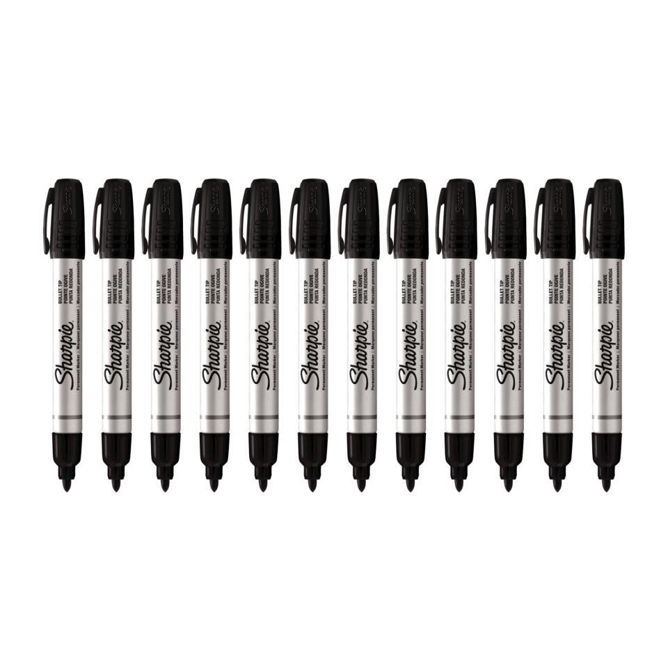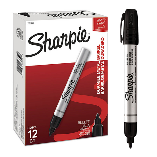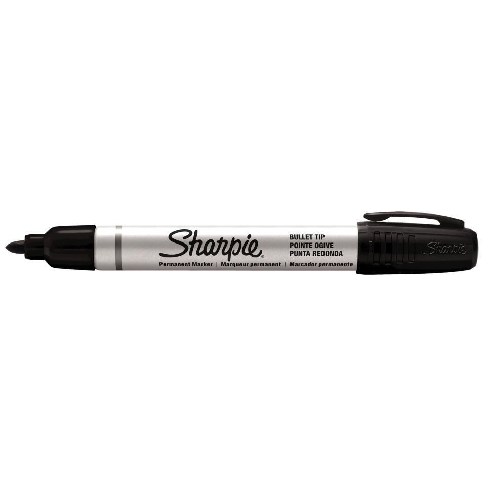 Sharpie Metal Permanent Marker Bullet Tip Blk New Packaging Bx12 marks on wet and oily surfaces and creates clear lines on plastic, wood, stone, foil, metal, corrugate, and leather. Tip: Bullet. Color: Black