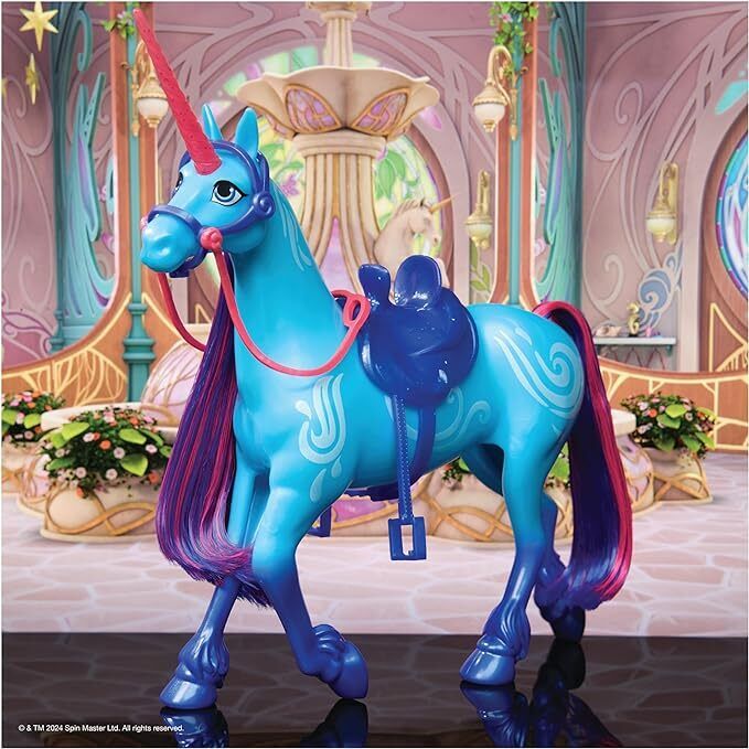 Inspired by the NETFLIX animated show and best-selling book series where friendship reins, this 11-inch River unicorn toy brings the gentle, shy creature to life. Beautifully detailed, River features pearlescent Water Magic markings on his side, majestic glittery horn, colorful mane and tail, and removable bridle and saddle doll accessories for added play. Gently move River's head to bring out his personality and relive the magical bonding experience between unicorn and rider with Isabel. Brush River's soft mane and tail with Isabel's styling tool (not included, sold separately with doll) and ride into adventure to protect Unicorn Island and its magic.